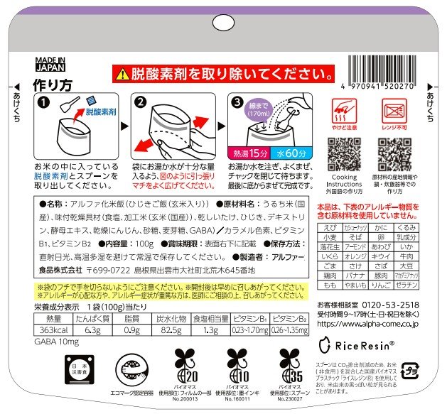 Non-glutinous rice (domestic), seasoned dried ingredients (salt, processed brown rice [domestic], dried shiitake mushrooms, hijiki seaweed, dextrin, yeast extract, dried carrot, sugar, maltose, barley lactic acid fermentation liquid [GABA])